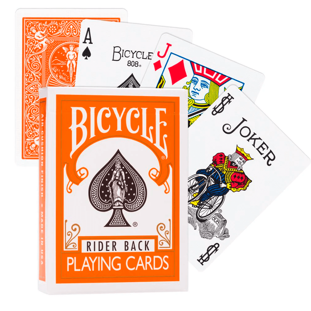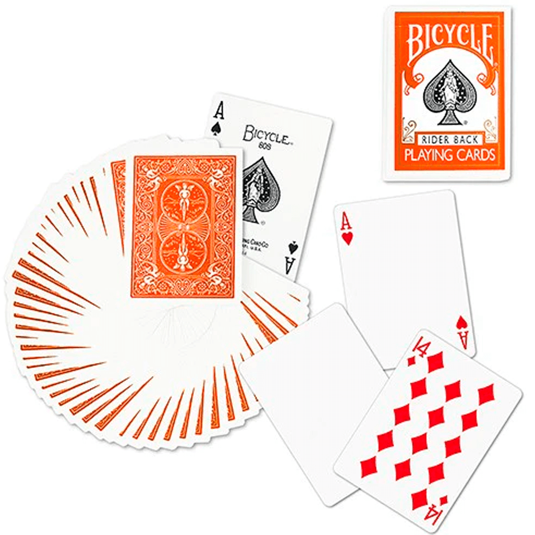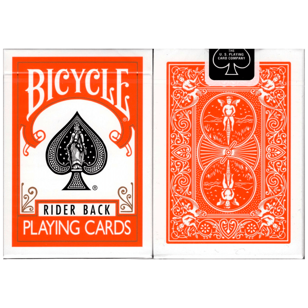 Baralho Bicycle Rider Back Laranja. Um deck simplesmente icônico no mundo das cartas, um símbolo de qualidade e confiança há mais de 130 anos. Ideal para mágica, jogatina comum e floreios complexos. Original, lacrado e produzidos nos Estados Unidos.