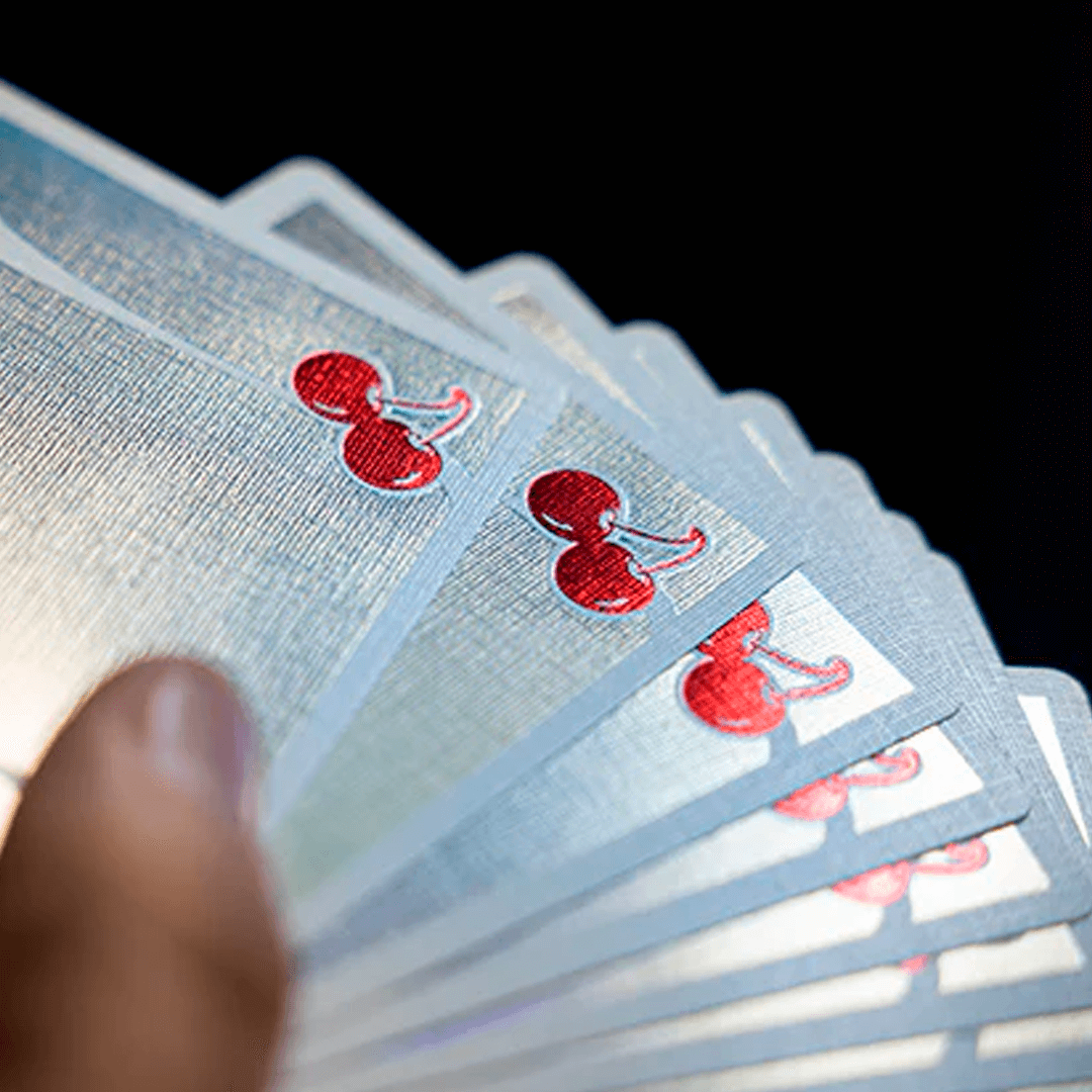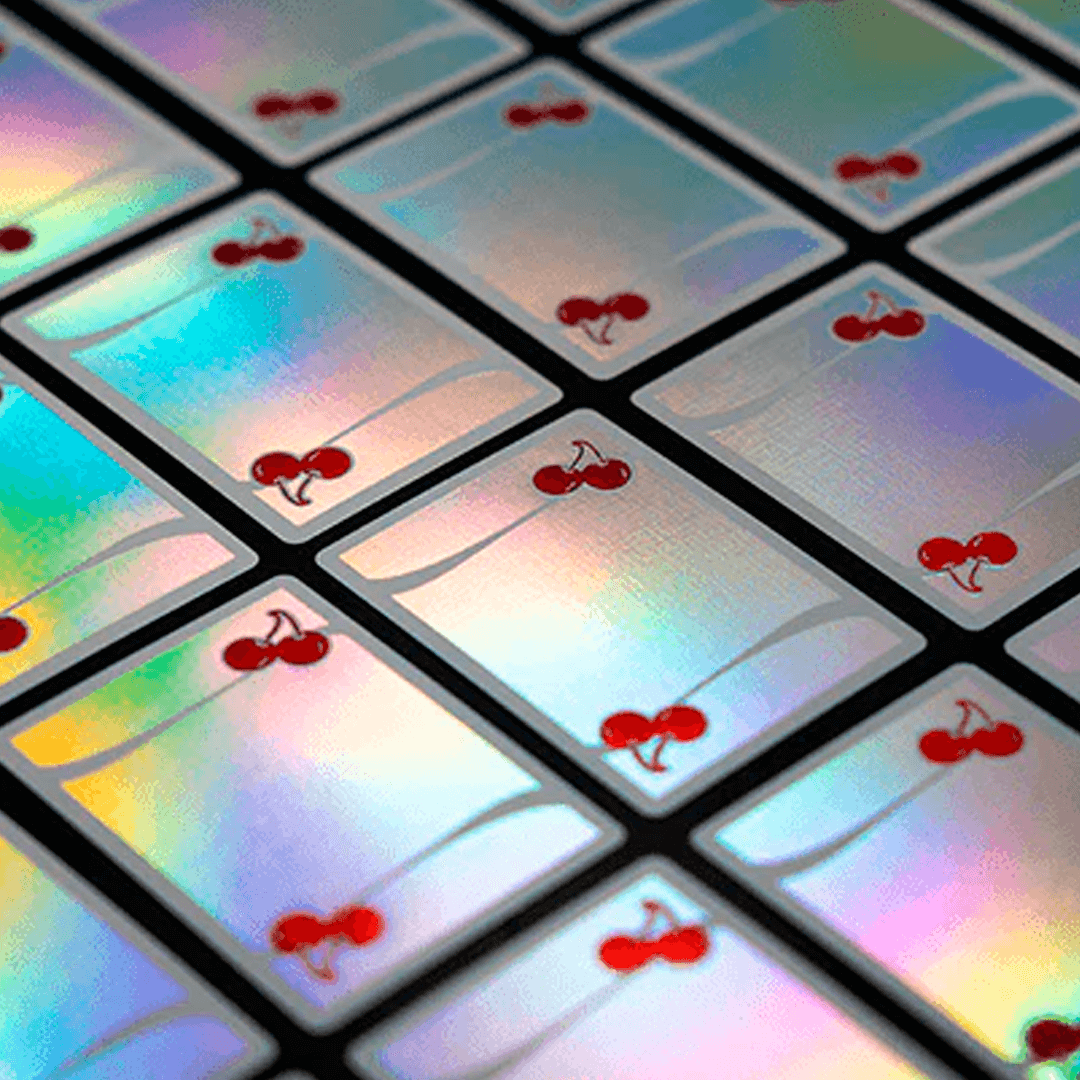 Prepare-se para brilhar na mesa com o Cherry Casino Sands Mirage holográfico. As cartas apresentam um design elegante, com o icônico logo das cerejas no verso, agora realçado pelo efeito prismático que muda de cor conforme o ângulo da visão e luz.