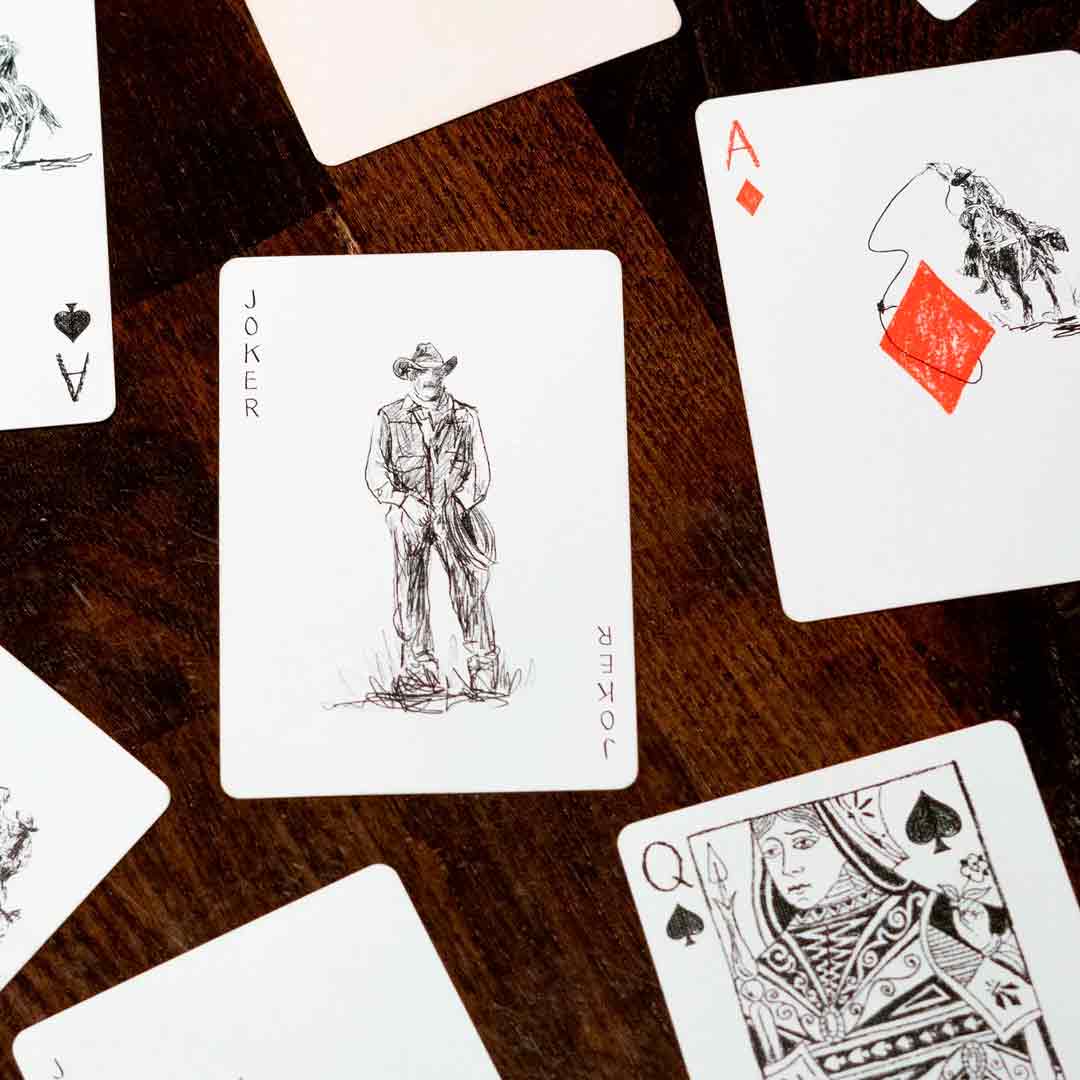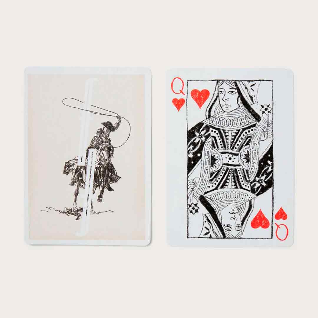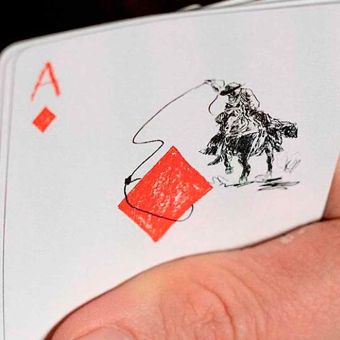 Esse baralho foge do minimalismo clássico da Fontaine e aposta em um estilo mais artístico. As faces trazem desenhos de cowboy e elementos do faroeste, combinando com o icônico dorso de “F” da Fontaine.