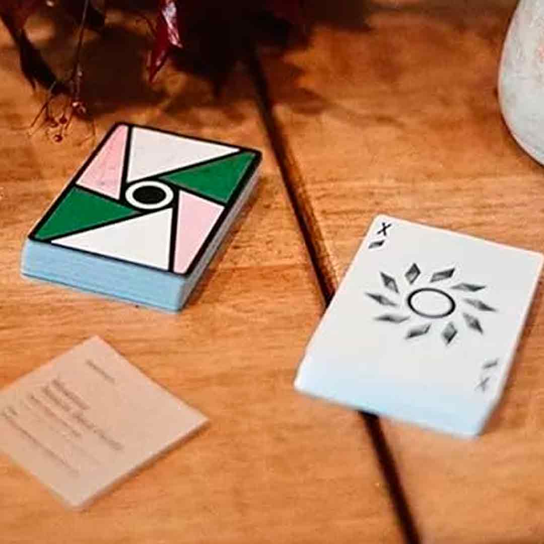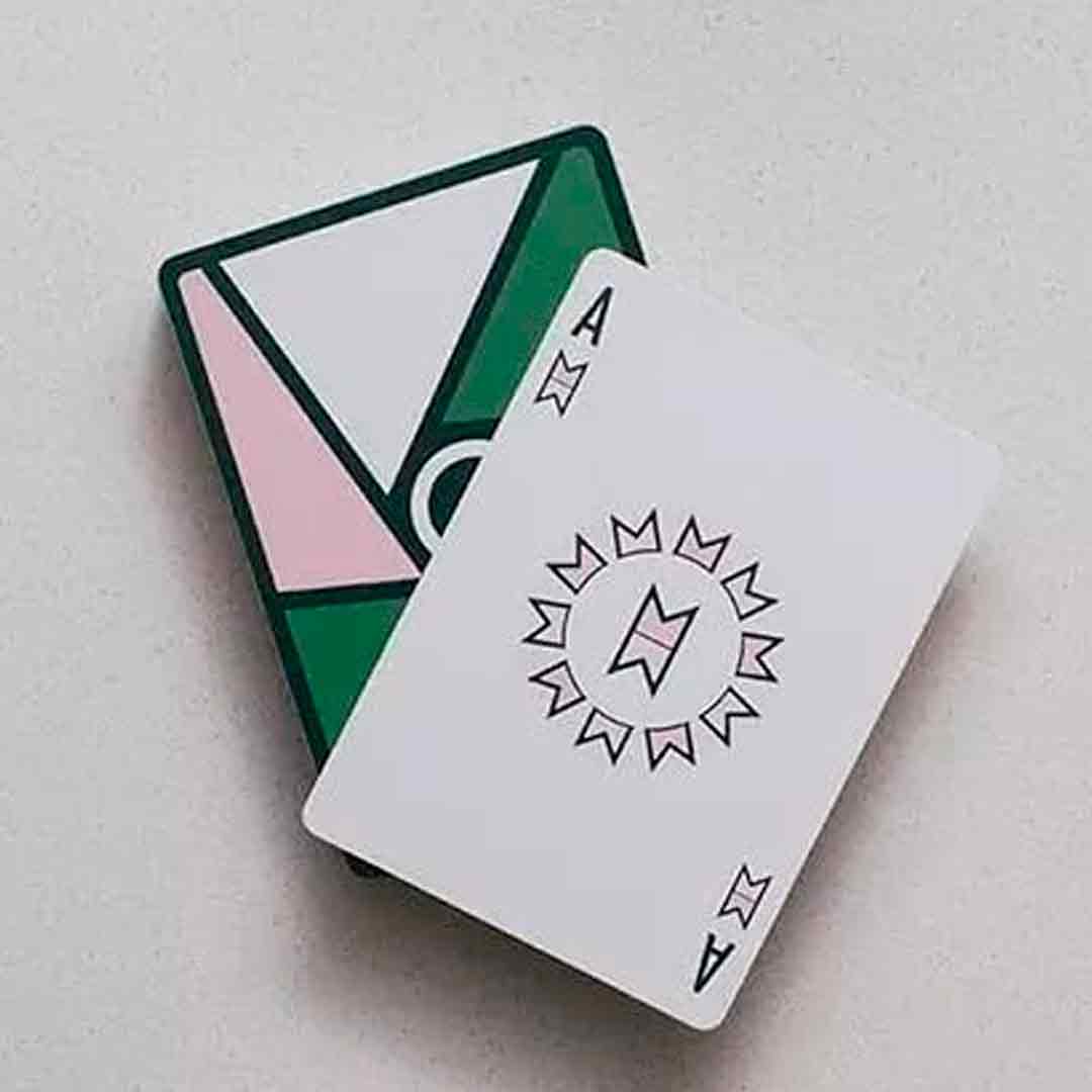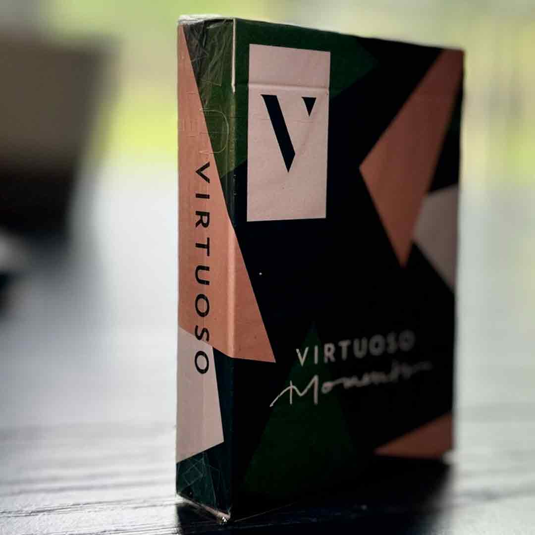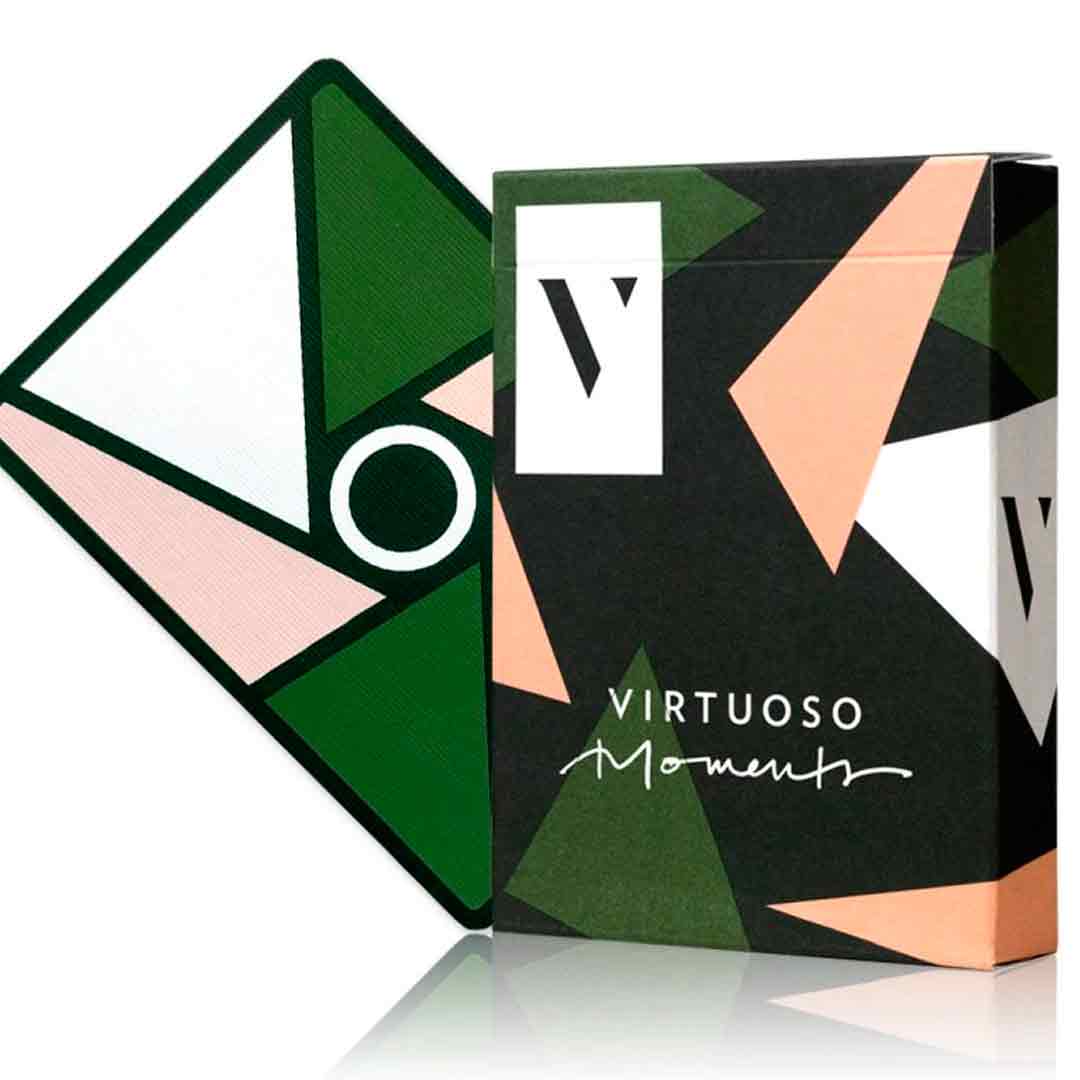 O Baralho Virtuoso Moments Open Court II se destaca pelo design geométrico moderno no verso, com combinações de cores como verde, rosa, branco e preto, criando uma estética limpa e visualmente impactante, sendo ideal para quem curte manipular cartas com estilo, fazer cortes, leques e movimentos que parecem arte na mão.